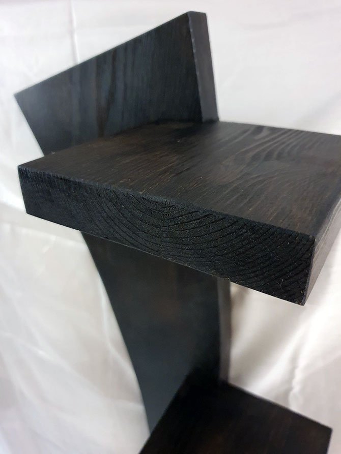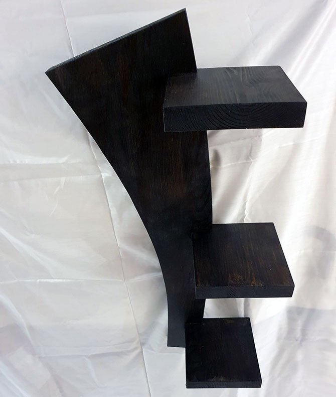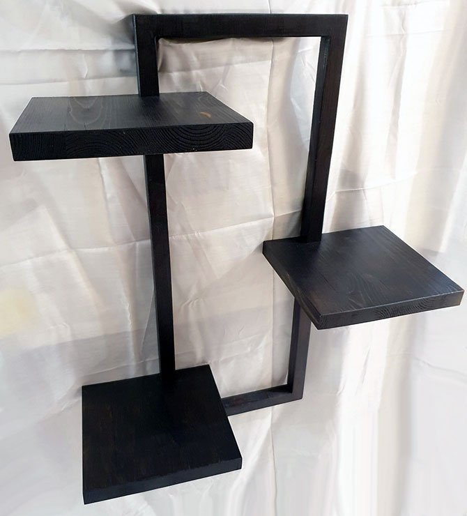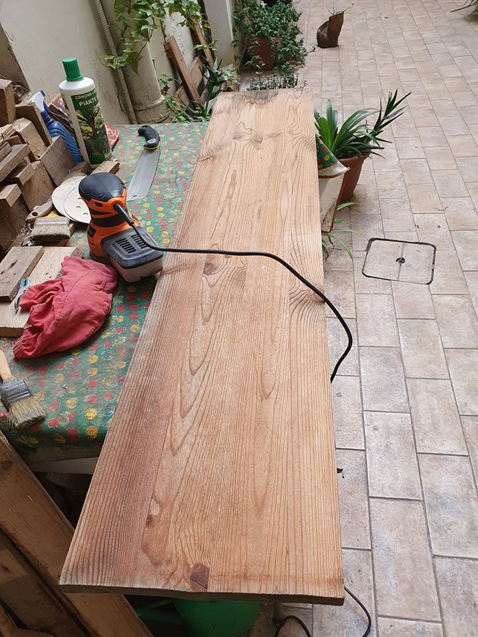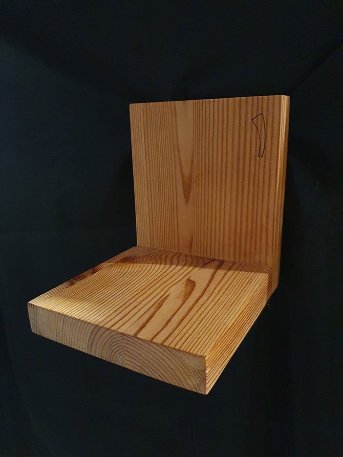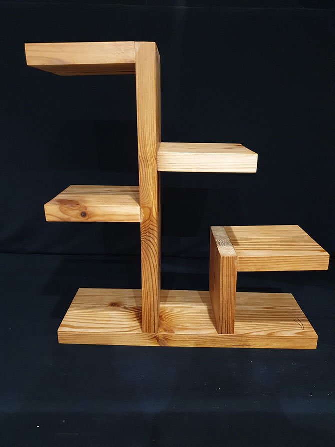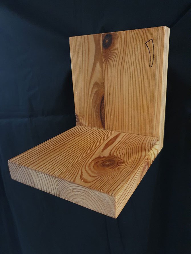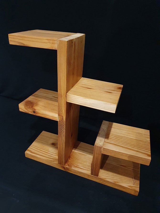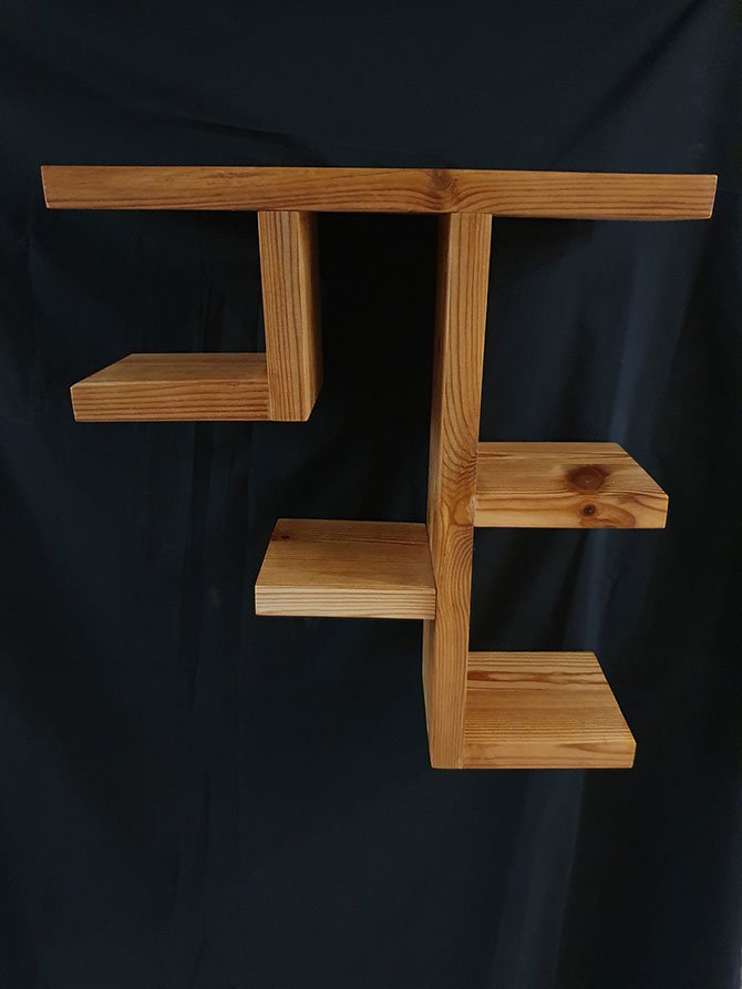 Da due tavole listellari di lunghezza 1.5mx30cm e 2mx30cm di larice sono state prodotte due mensole di altezza circa 70cm, una di altezza e larghezza di circa 45cm e sei piccole di circa 15cm.