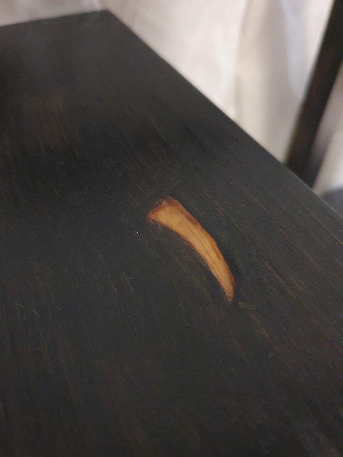 Il simbolo dell'apostrofo è stato riprodotto con pirografia e con un intaglio e riempimento in resina epossidica trasparente.