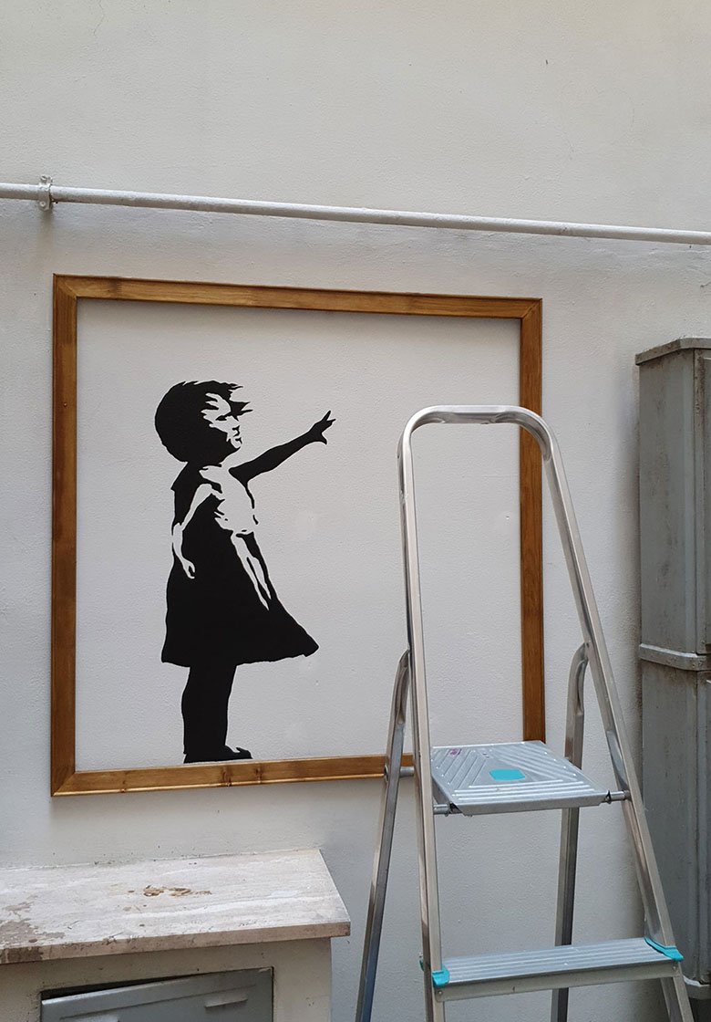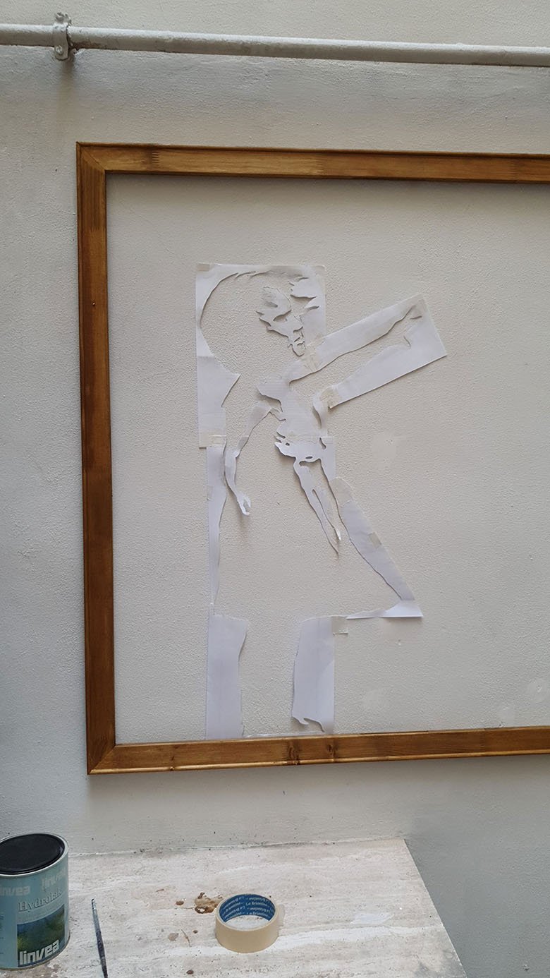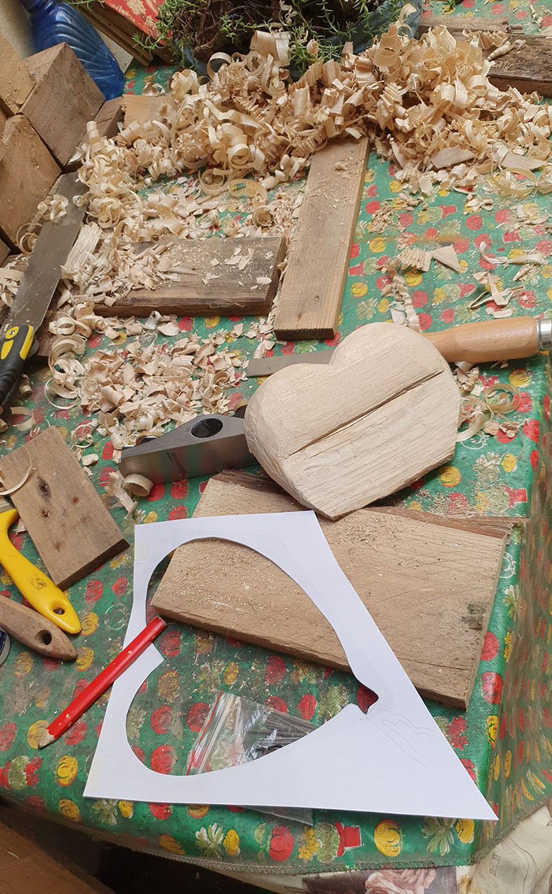 Spruce wood, scrap wood. Putty. Black enamel and red acrylic.