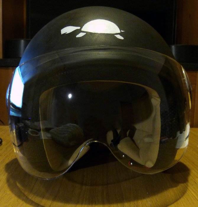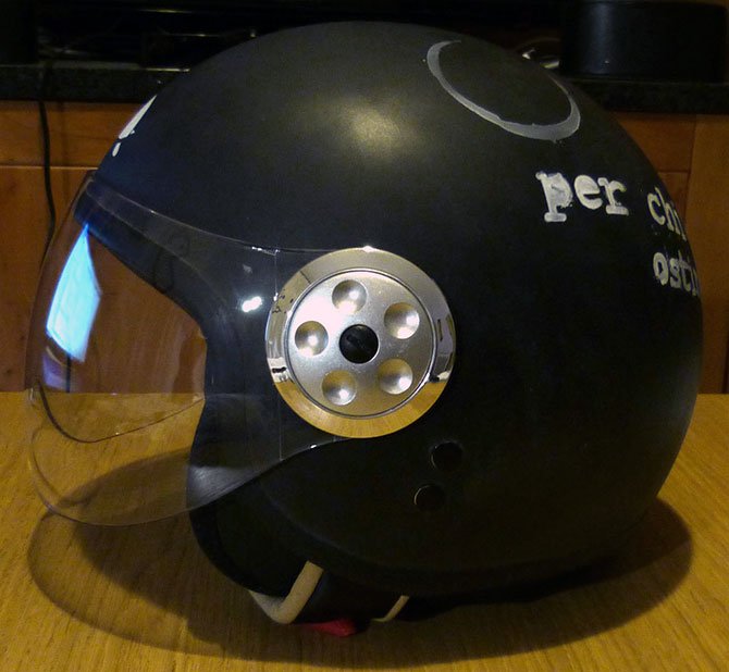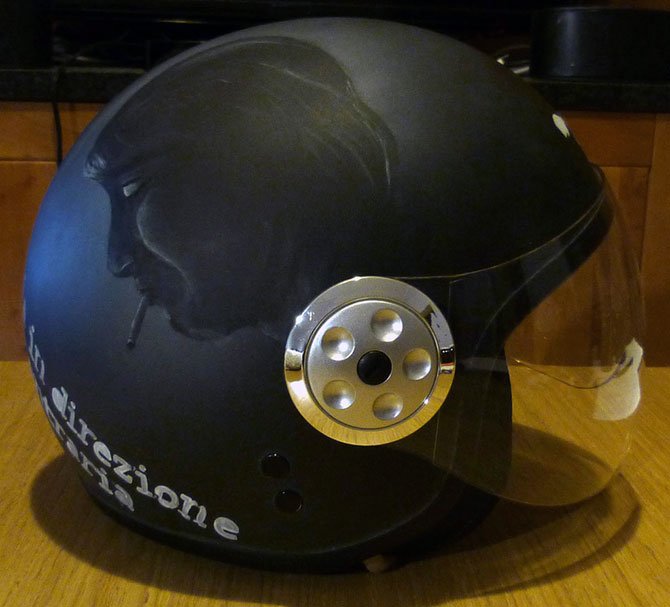 This hand-painted moped helmet pays homage to the great Fabrizio De Andrè, capturing his piercing gaze and rebellious poetics.