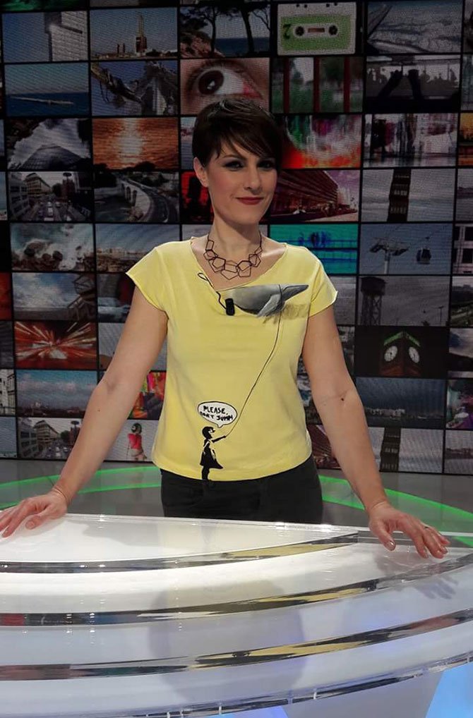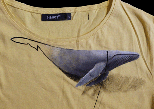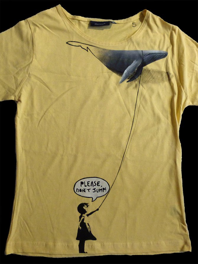 This is not a simple knit; it is a work of art in motion. Hand-painted, it combines the rebellious delicacy of Banksy's little girl with the majesty of a blue whale, here created in such a way as to create a graphic conjunction between 2 and 3 dimensions.