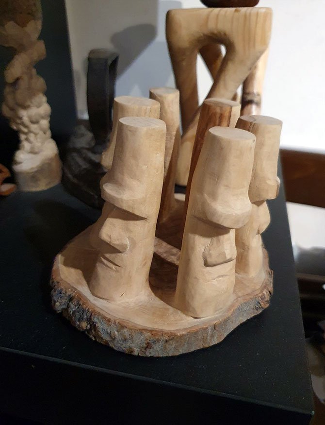 Bring home a piece of history and mystery with this Olive Tree Sculpture depicting Rapa Nui Island in a stylized version.